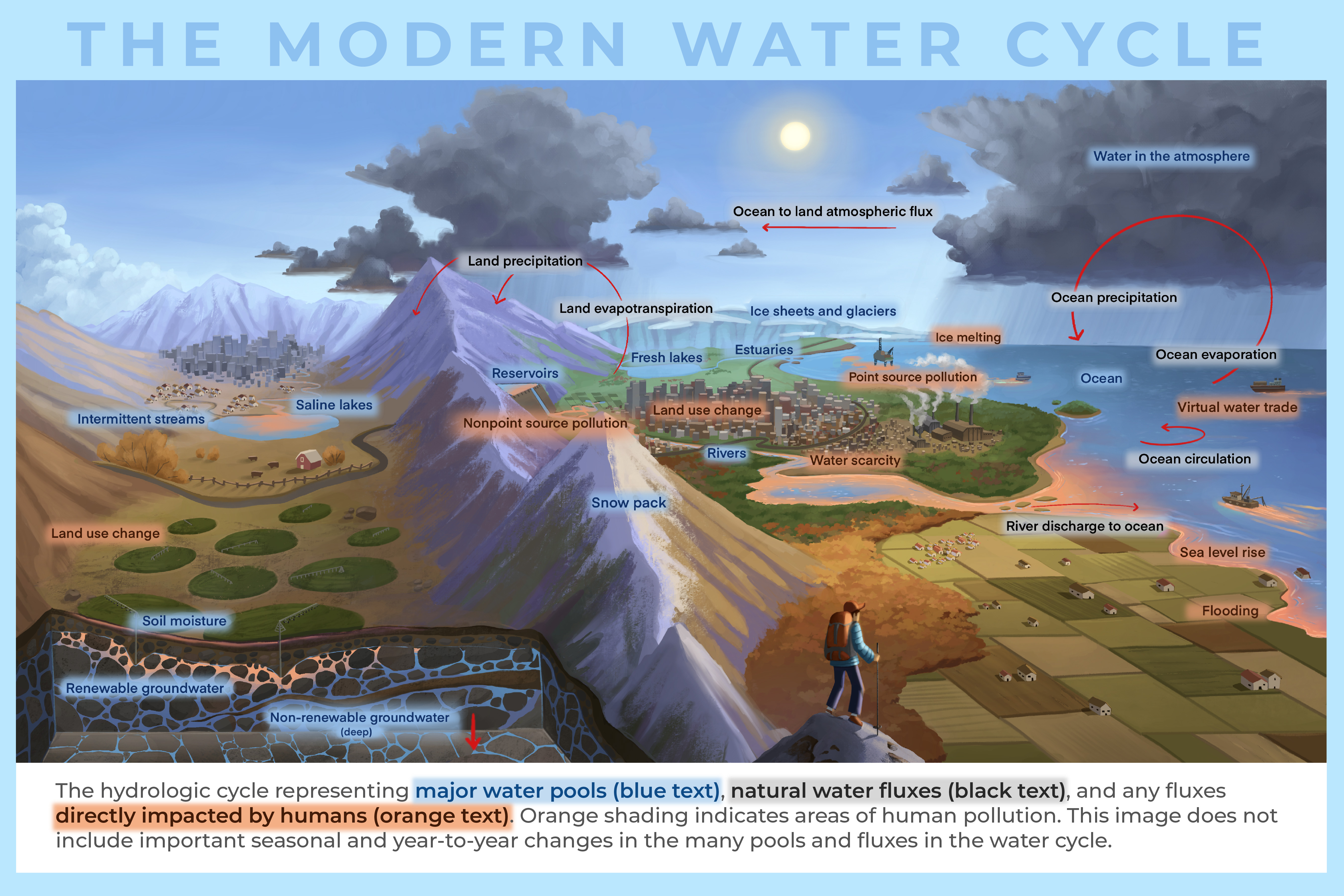 Research from our group has shown that the majority of water cycle diagrams do not include humans. We created an image where human influence is evident across the landscape but also wanted to test the effectiveness of this modification. We created following parallel series of images to study this.