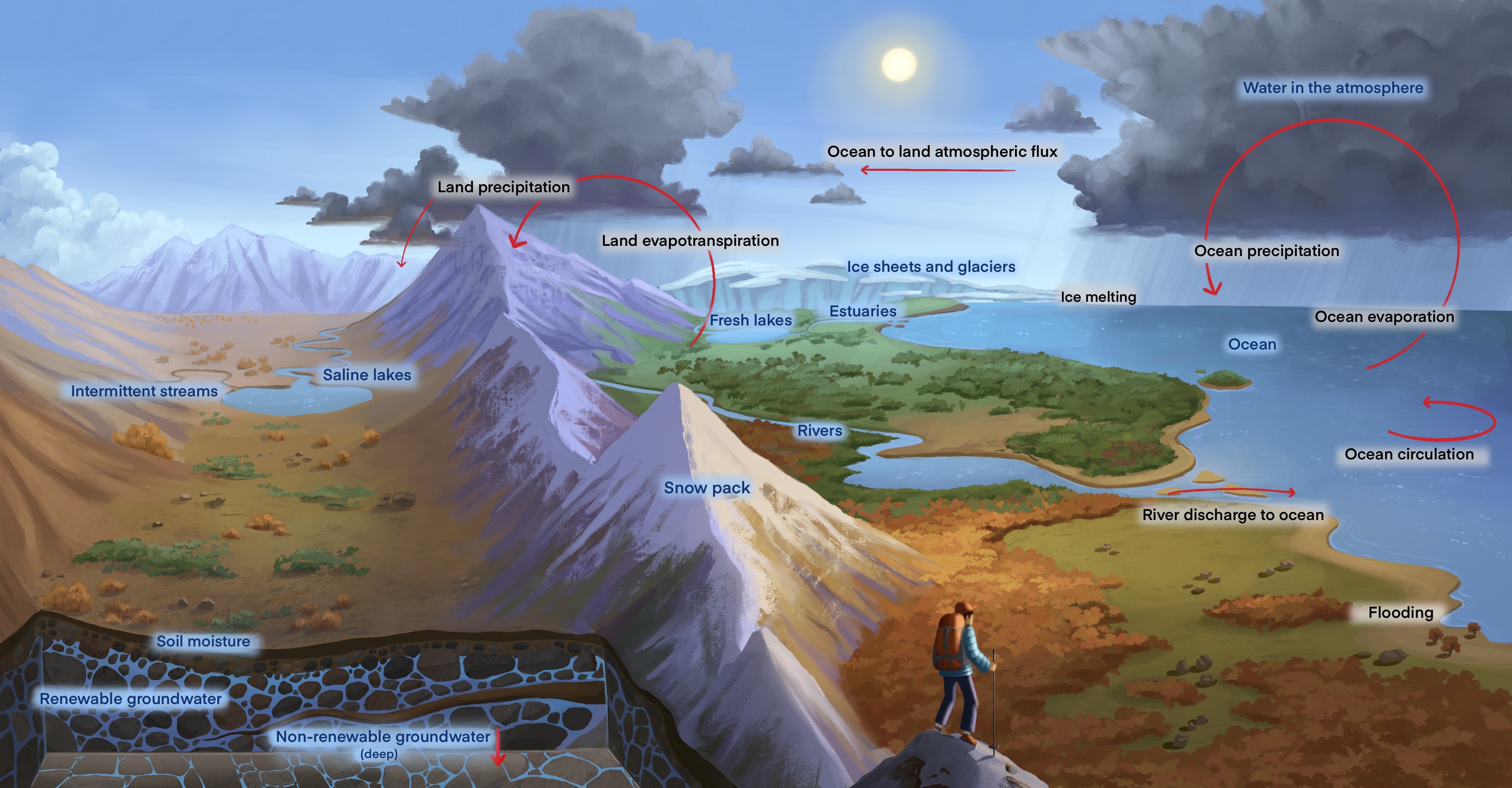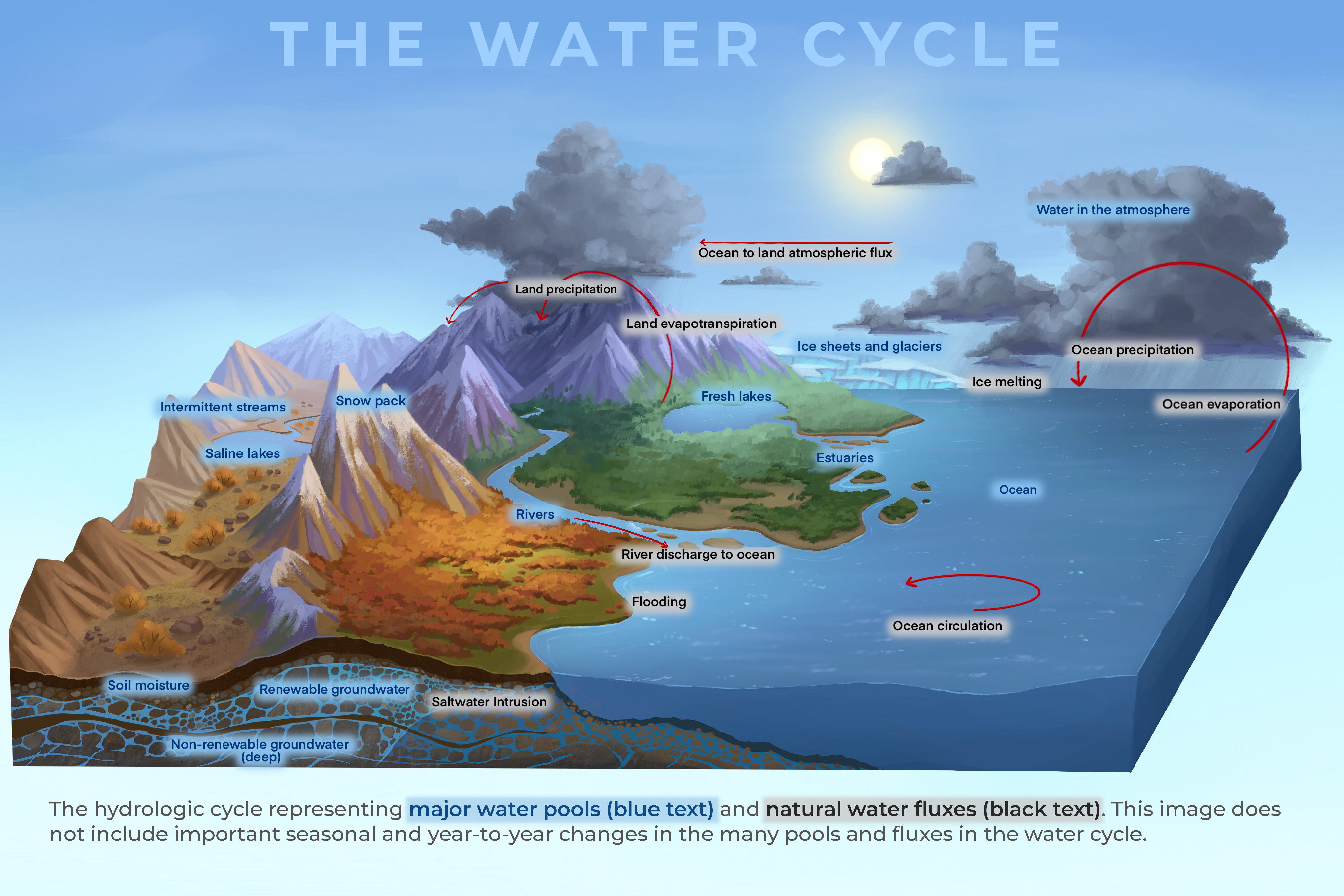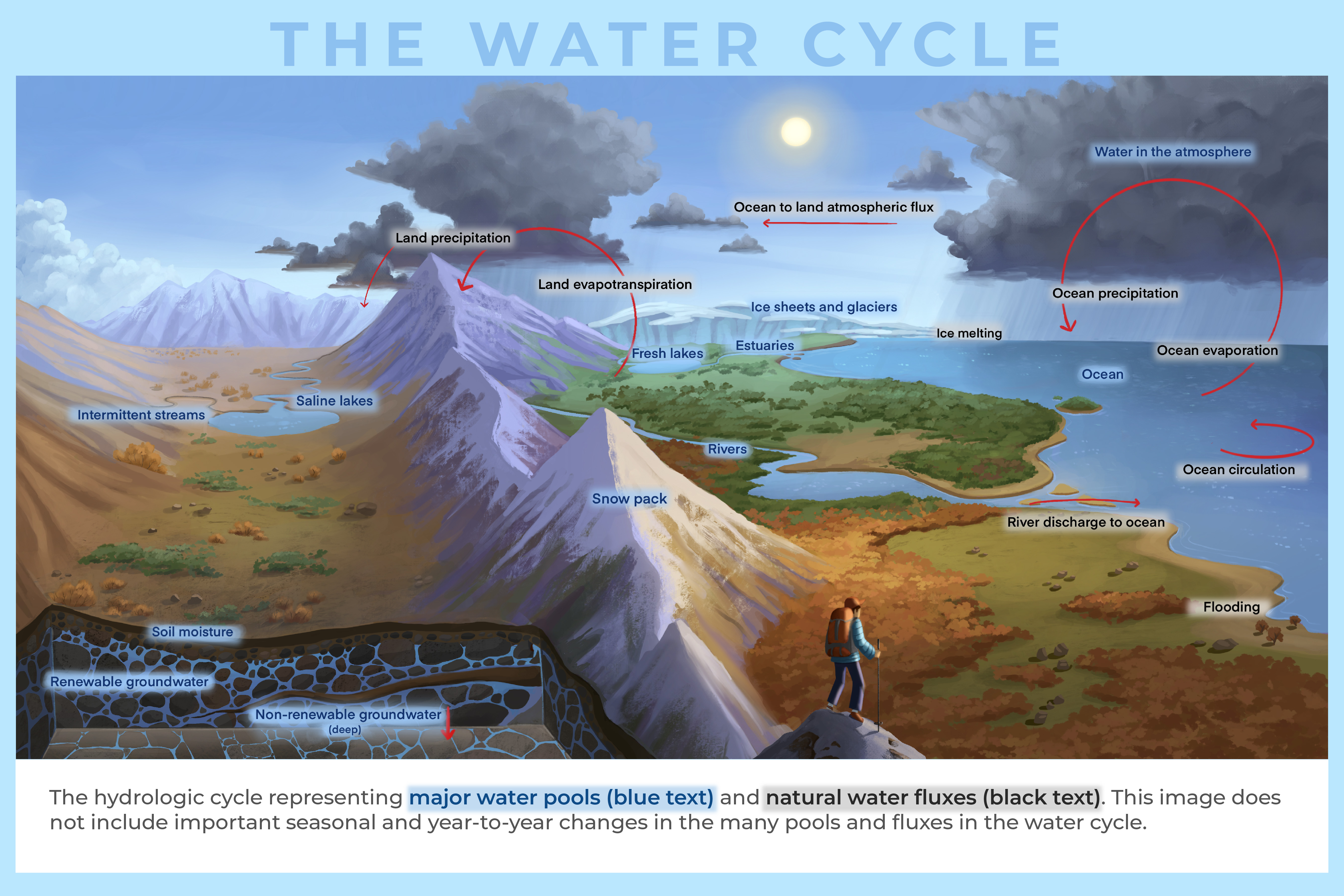 Our image includes ideas of water quality and contamination as well as multiple watersheds and emphasizing a connection with groundwater. We also explored the idea of different perspectives to show the cycle from a more familiar view. See our Where is the Water? series for more on this.