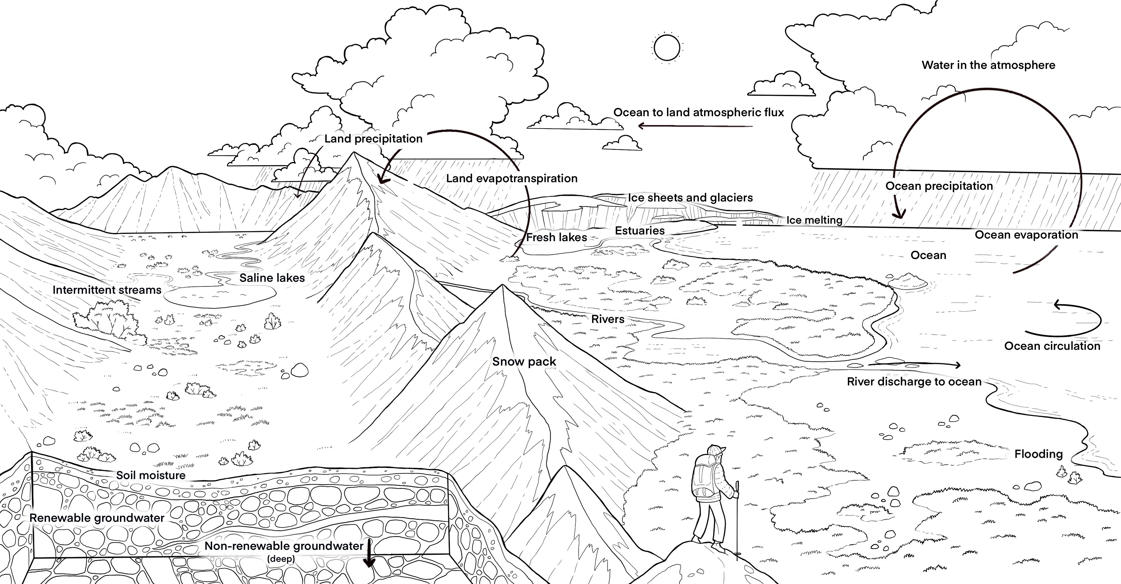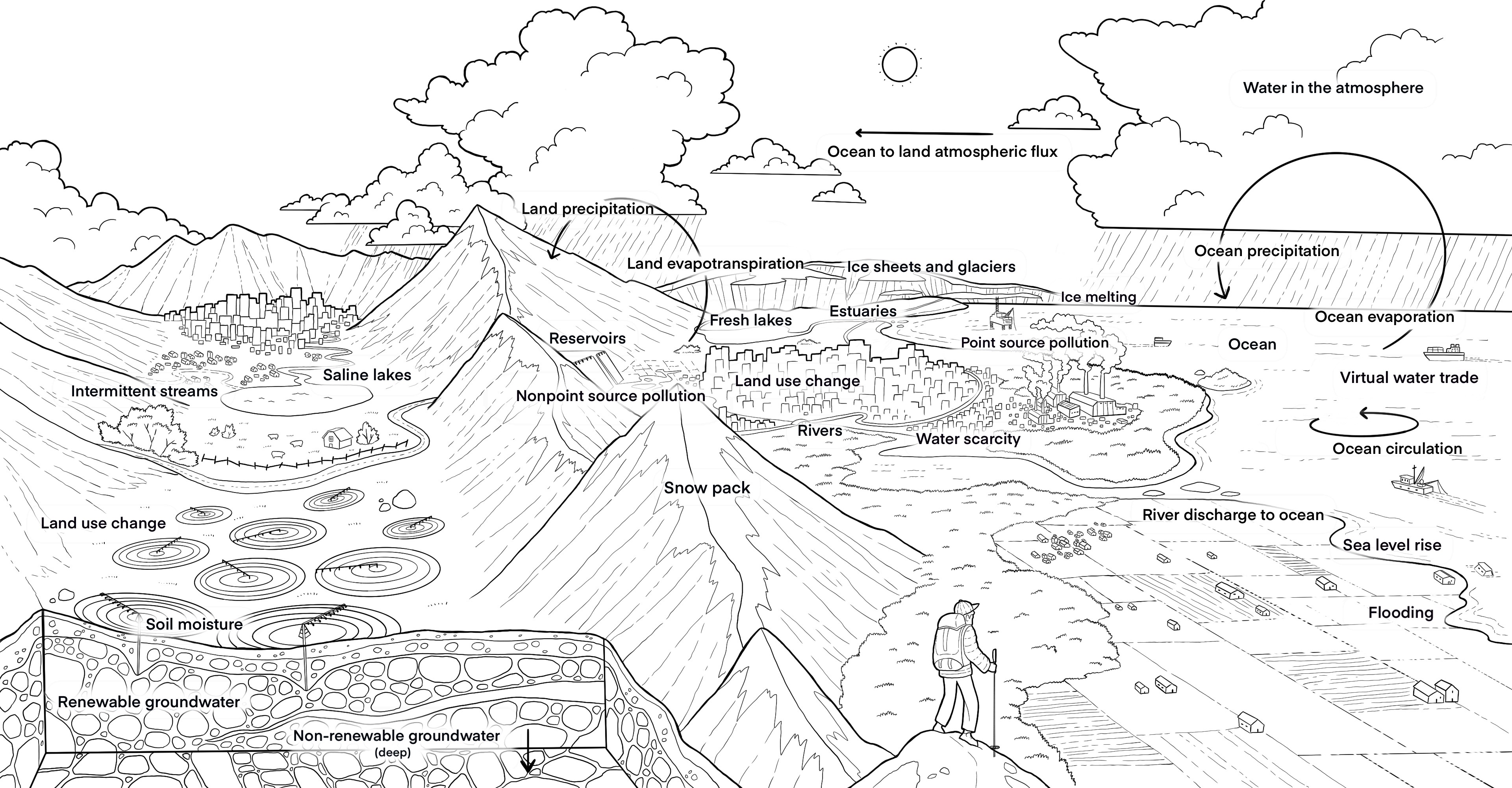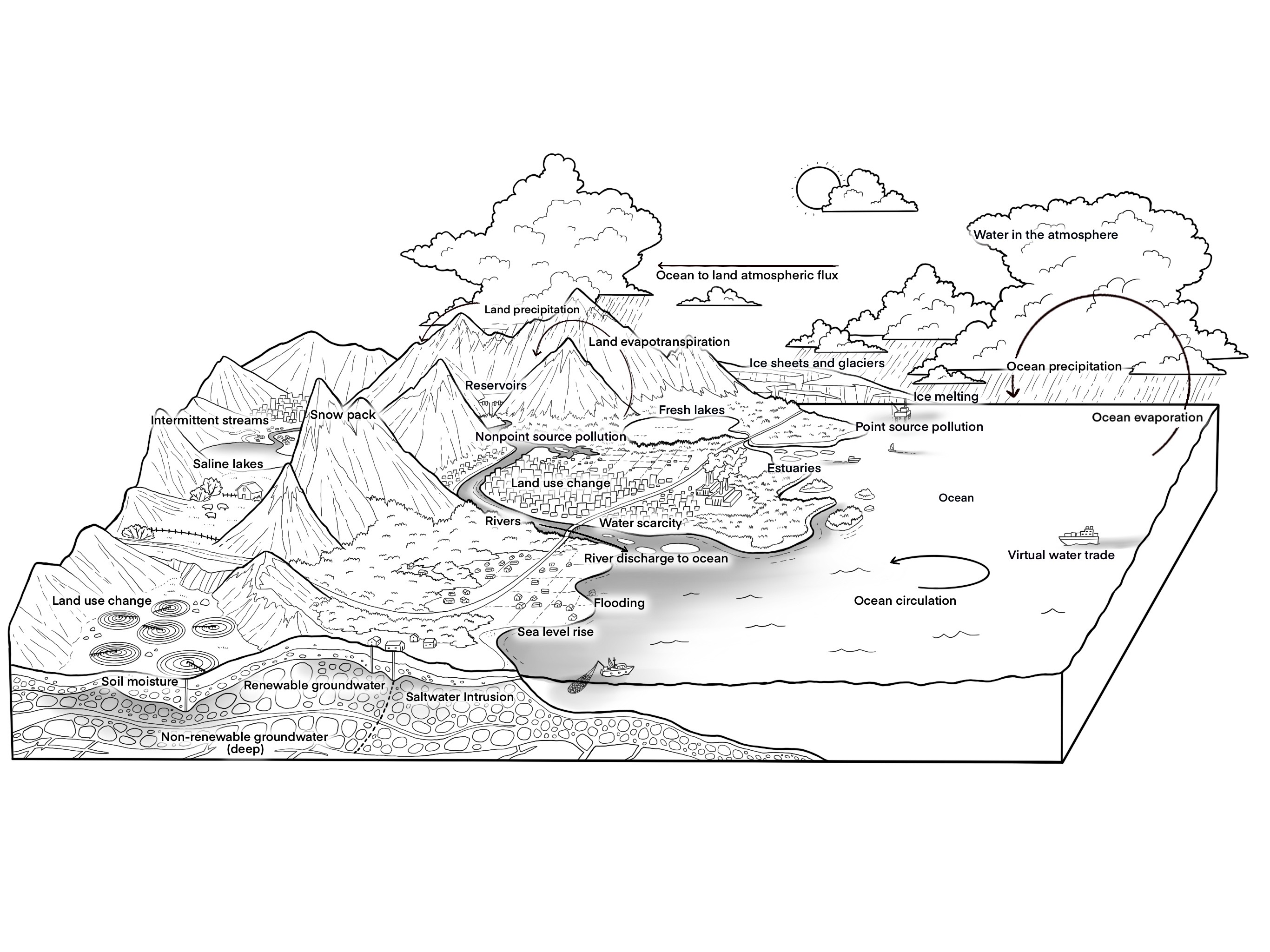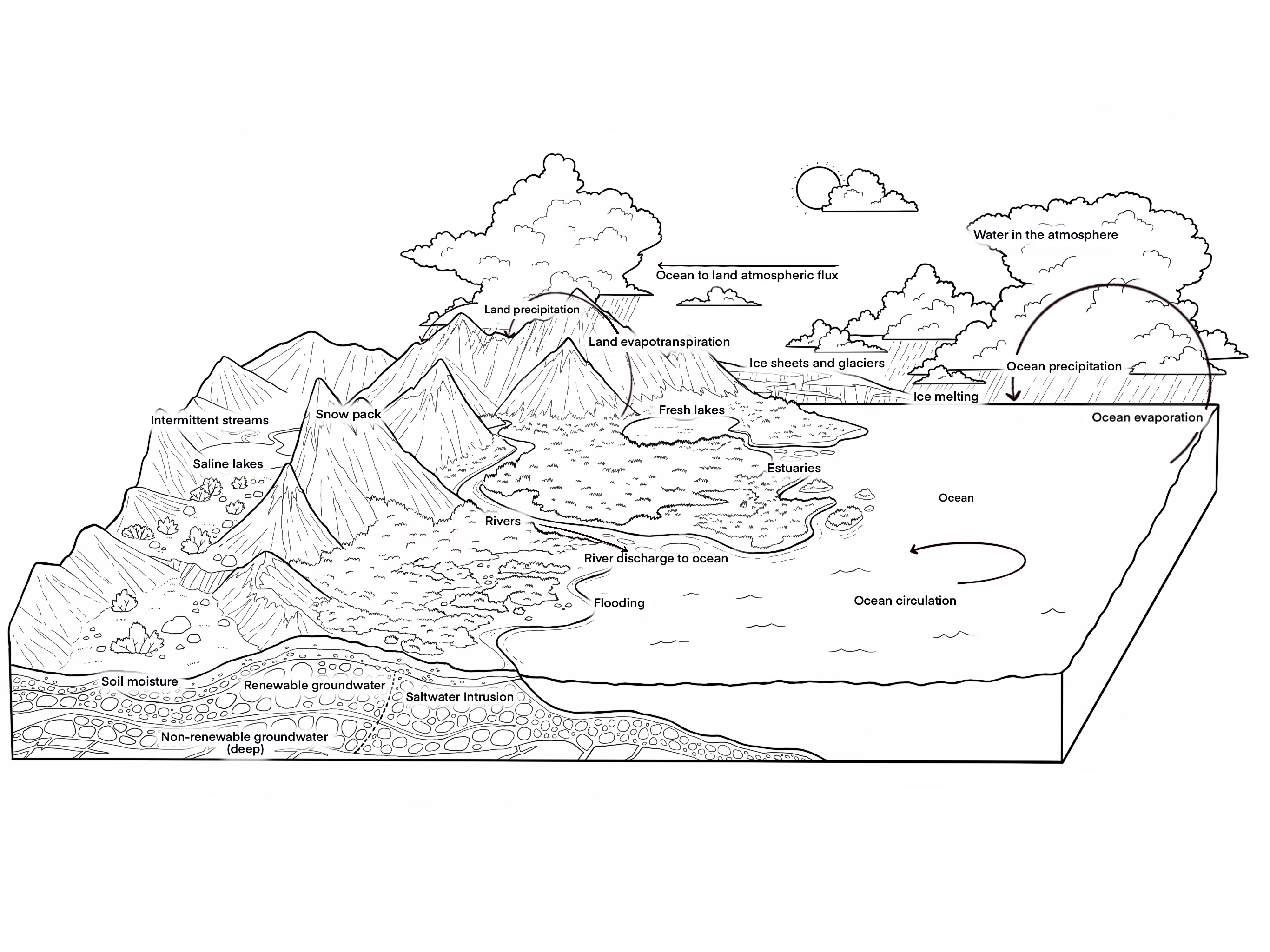 As always, you can use our black and white images to have students highlight water on the landscape. You can also use this diagram to trace water from one location to another (e.g. "How might a water molecule get from underground to a cloud over the ocean?"). This encourages students to explore water as a vast and interconnected system. They can also try to highlight which fluxes are human-related and which are more naturally caused.